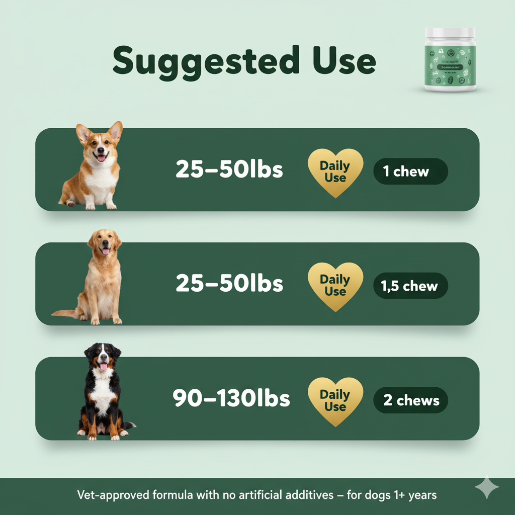 Most dogs tolerate the formula well. A small number may experience temporary loose stool, gas, or reduced appetite when starting any new supplement. If you notice vomiting, diarrhea lasting more than 24–48 hours, lethargy, or any unusual behavior, stop use and contact your vet.