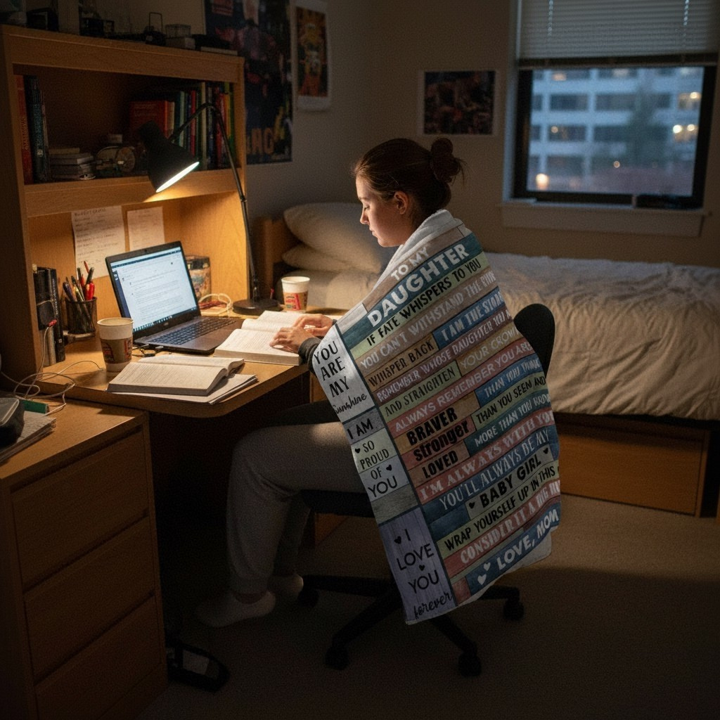 This isn’t just a blanket — it’s a father’s voice, stitched into fabric. A message she can wrap around her shoulders when the world feels heavy.